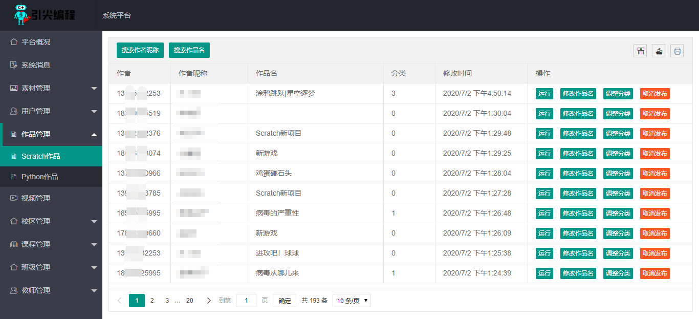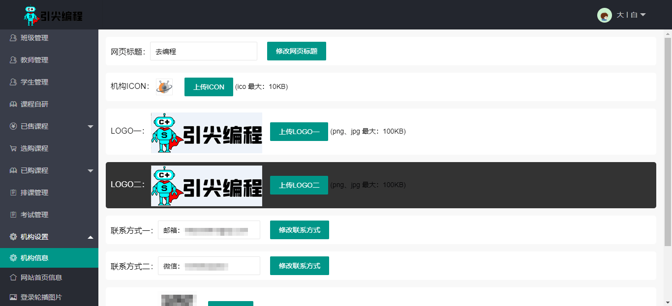 学习平台:学生班级、作品管理、作业管理、收藏管理教师平台:班级管理、课程管理、学生管理、作业管理、考试管理、报名管理校区平台:班级管理、学生管理、排课系统、课程自研、课程选购、考试管理机构平台:多校区管理、课程外售、课程选购、个性域名、界面定制、默认作品定制系统平台:多机构管理、课程管理、平台管理、作品管理、用户管理、系统平台课程系统:自研、分销;每堂课都可含学习目标、内容、知识点、教学实例、作业模板、PPT课件、教学大纲PDF、教学视频素材系统:上传、采集、分享作品系统:创作、改编、分享、讨论积分系统:创作、上传素材、挑战、打卡等任务获得分享系统:PC、平板、手机三端通用,作品、班级招生、课程外售---合作共赢,欢迎您加入少儿编程_少儿编程普惠平台一起创造未来---