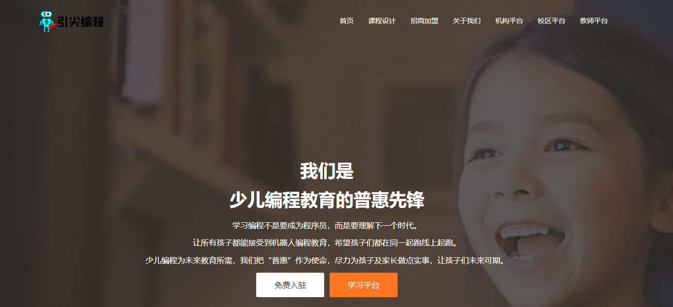 学习机器人、编程、AI不是要成为程序员,而是要理解下一个时代让所有孩子都能接受到机器人编程教育,希望孩子们都在同一起跑线上起跑少儿编程为未来教育所需,我们把“普惠”作为使命,尽力为孩子及家长做点实事,让孩子们未来可期我们着足于少儿编程教育普及与普惠---合作共赢,欢迎您加入少儿编程_少儿编程普惠平台一起创造未来---